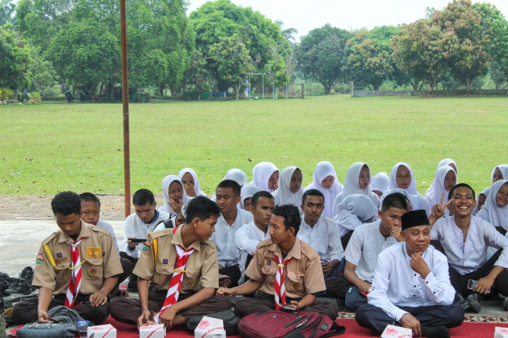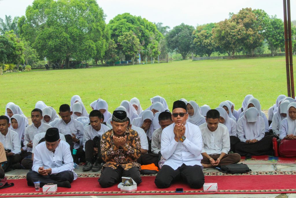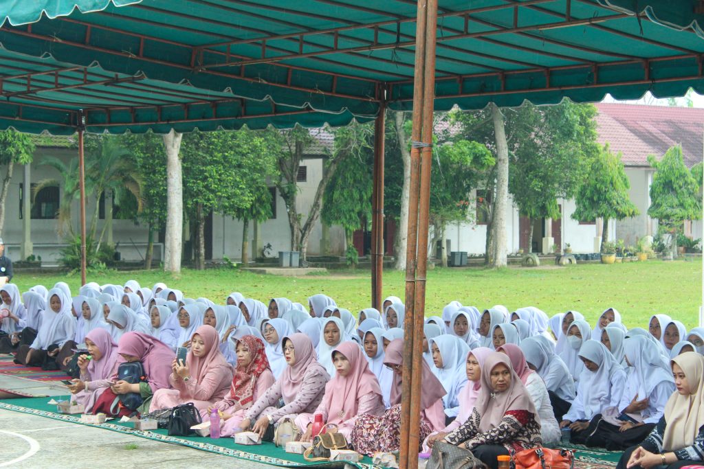 Siswa/siswi SMAN 4 Kisaran serta guru/staff TU mendengar dengan seksama isi ceramah yang disampaikan ustad Ustadz H. Drs. Syamsuddin, M.Pd.