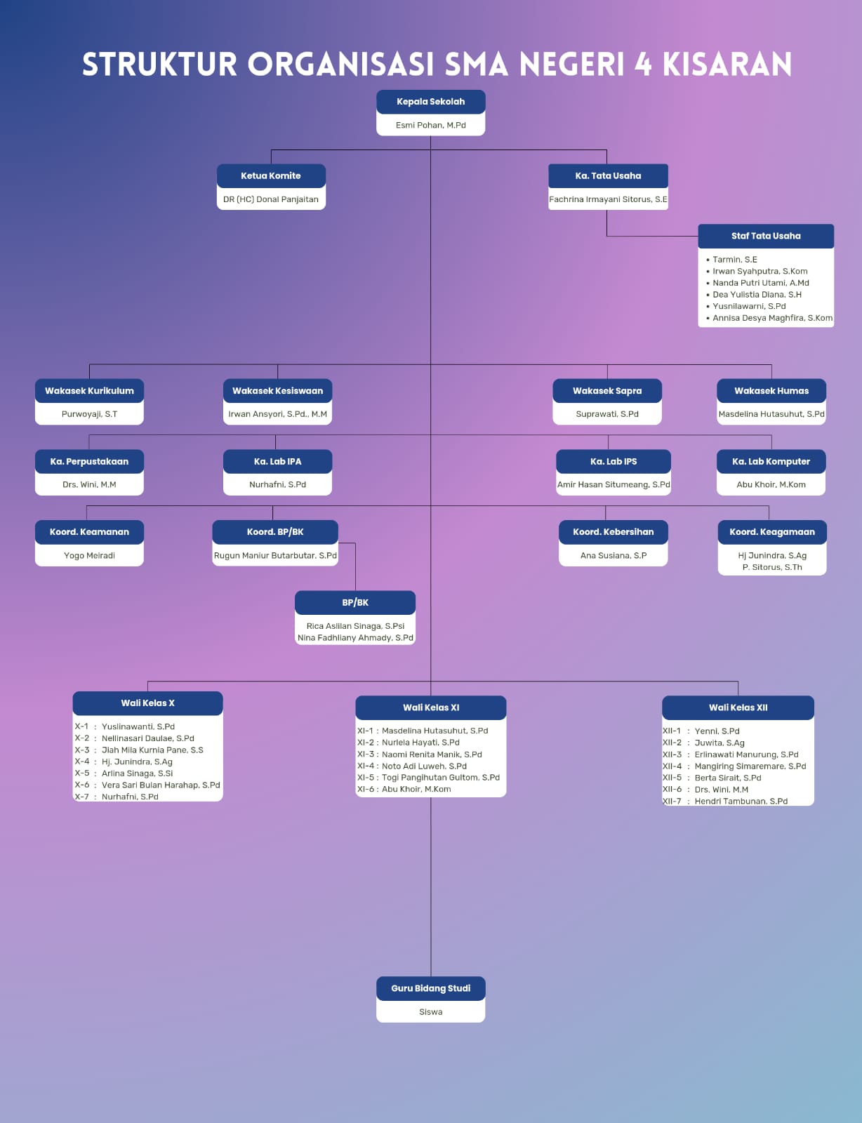 Berikut adalah struktur organisasi pengurus dilingkungan SMA Negeri 4 Kisaran